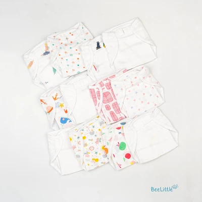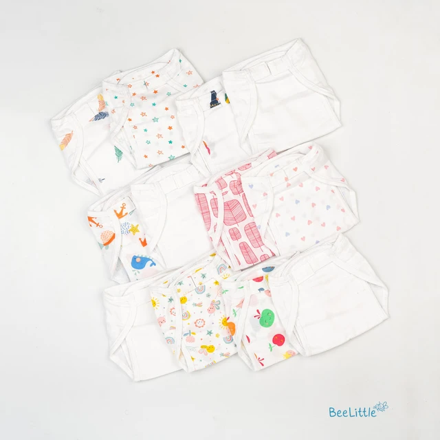 Pack of twelve newborn reusable muslin nappies. Couple of loops stay upfront, whilst the wide area is edged with tie-ups. Finley sewn side seams, prevents young infants from rashes and skin irritations.