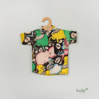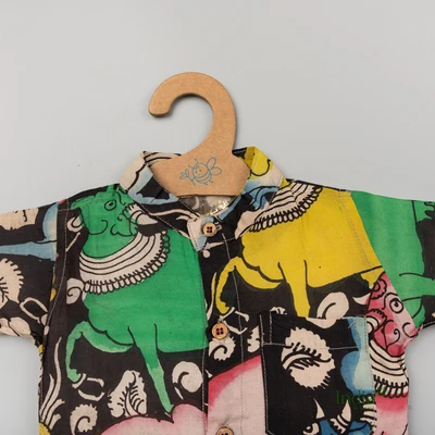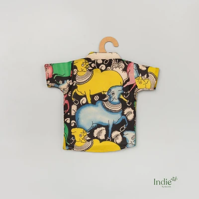 Black Pen Kalamkari Shirt With Checked Dhoti Set