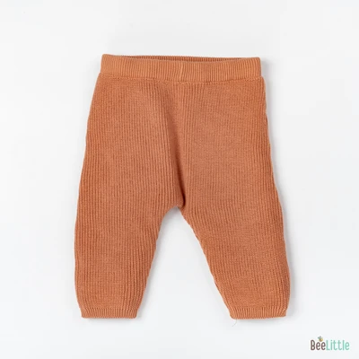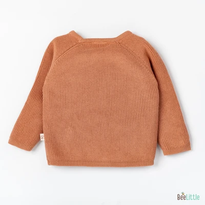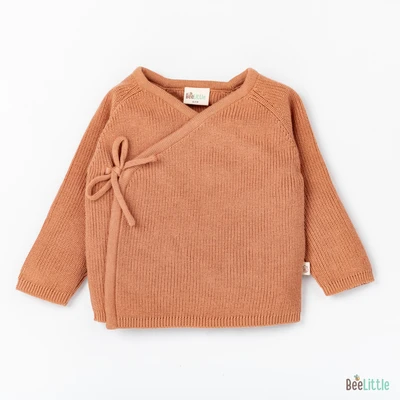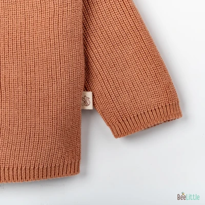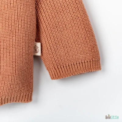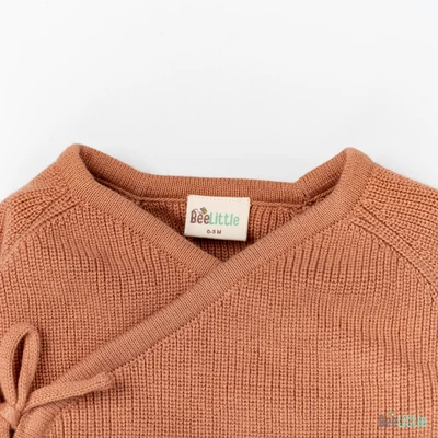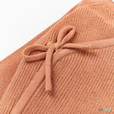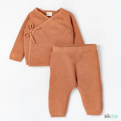 Organic warmer set consists of a sweater and pants. Knitted sweater in ribbed waist hem, round rib crew neck and long sleeves with cuffed trim. The kimono styled vest is secured with a tiny tie-up. Set up with knitted jogger style pants with waist elastication that can be slipped on.