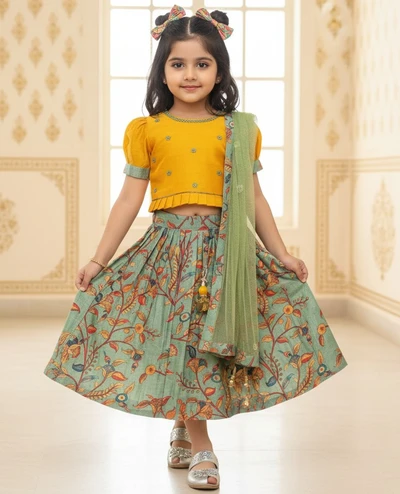 Olive Green Puff Sleeve Top And Pleated Lehenga With Dupatta