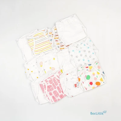 Pack of twelve newborn reusable muslin nappies. Couple of loops stay upfront, whilst the wide area is edged with tie-ups. Finley sewn side seams, prevents young infants from rashes and skin irritations.