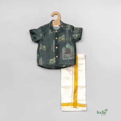 Green Flora Kalamkari Shirt With Checked Dhoti Set