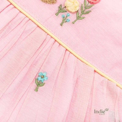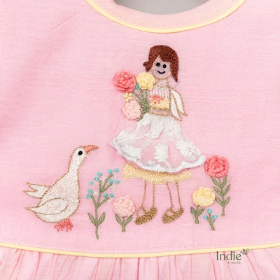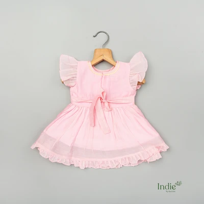 Girl With Duck Embroidered Baby Pink Frill Sleeve Tie-Up Frock