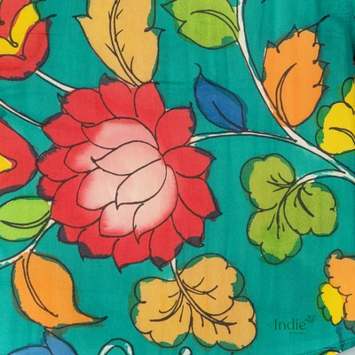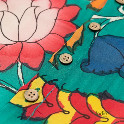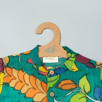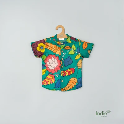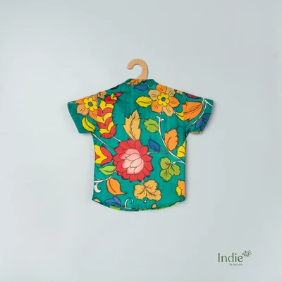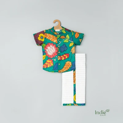 Green Flora Kalamkari Shirt With Checked Dhoti Set