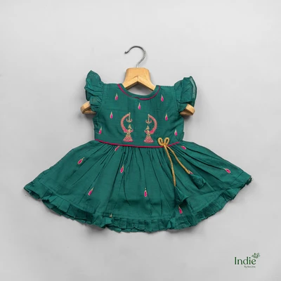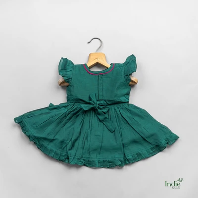 Green Cap Sleeve Embroidered Dress With Tie-Back