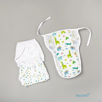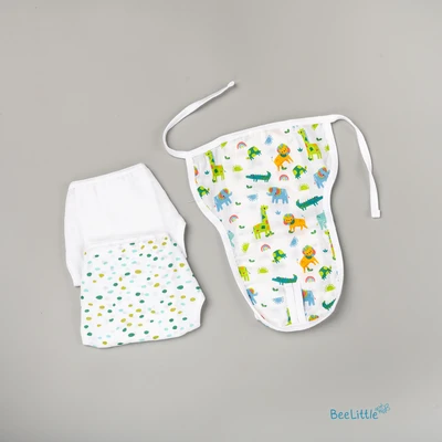 Pack of three newborn reusable muslin nappies. Couple of loops stay upfront, whilst the wide area is edged with tie-ups. Finley sewn side seams, prevents young infants from rashes and skin irritations.
