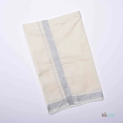 Traditional baby dhoti is the perfect addition to any special occasion. Made from soft cotton with a baby-friendly velcro that won't scratch or irritate your baby's skin. The dhoti is adorned with a stunning silver border, adding a touch of elegance to your little one's attire.