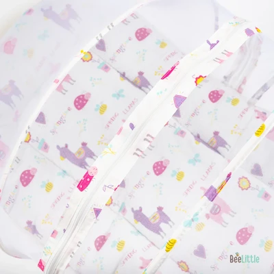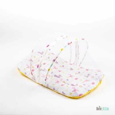 Newborn sleeping mattress with mosquito net is made from cotton material and stuffed with anti-allergenic polyfiber filling. Easy double zipper to build-up the net with two arched frame for support that holds the net wide and to keep it down when required.