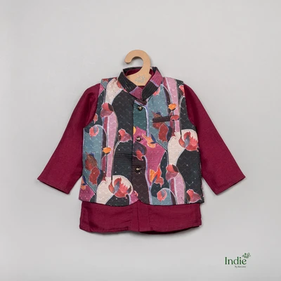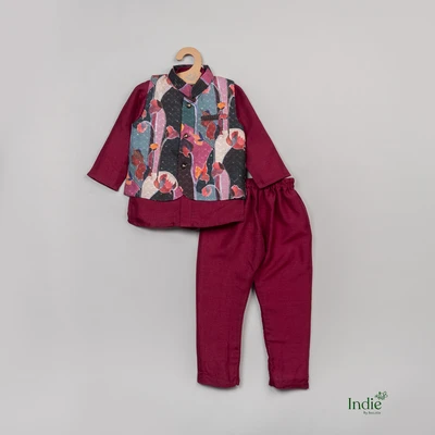 Magenta Kurta With Multifloral Printed Jacket And Pant