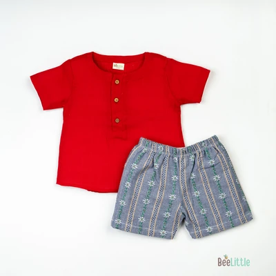 Mul Mul top and bottom set is the perfect blend of style and comfort. Featuring a mandarin collar, half sleeves, and vibrant ethnic print, the shirt is made with soft and breathable Mulmul fabric. The matching solid cotton shorts complete the look with a concealed elasticated waistband for a comfortable fit, creating an effortless outfit that's perfect for any occasion.