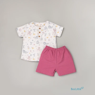 Mul Mul top and bottom set is the perfect blend of style and comfort. Featuring a mandarin collar, half sleeves, and vibrant ethnic print, the shirt is made with soft and breathable Mulmul fabric. The matching solid cotton shorts complete the look with a concealed elasticated waistband for a comfortable fit, creating an effortless outfit that's perfect for any occasion.