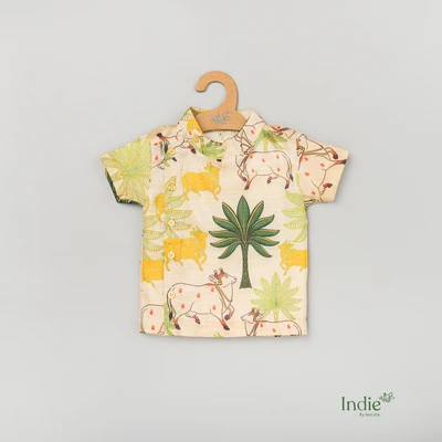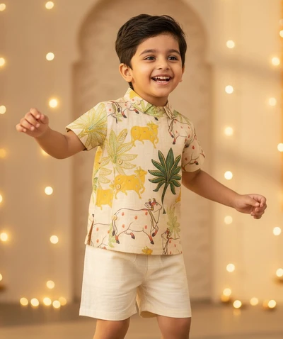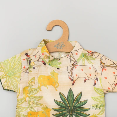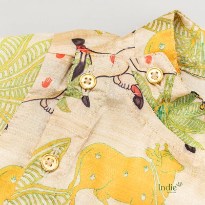 Yellow Pichwai Side Placket Shirt With Sandal Shorts