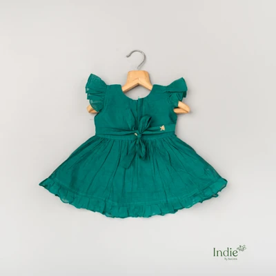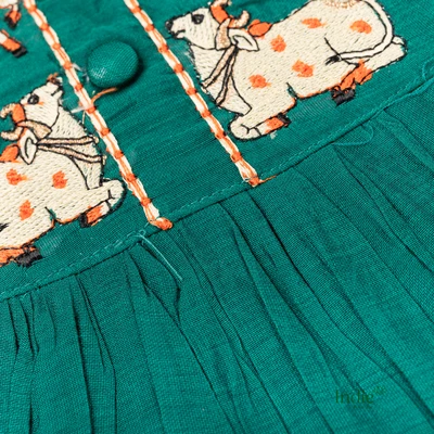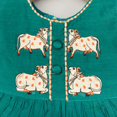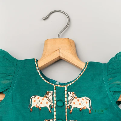 Off-White Cows Embroidered Peacock Green Frill Sleeve Tie-Up Frock