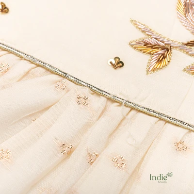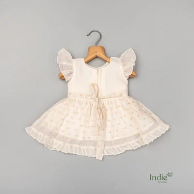 Off-White Golden Bird Emberoided Cap Sleeve Tie Up Frock