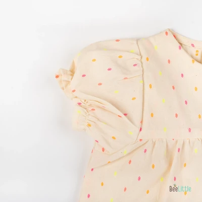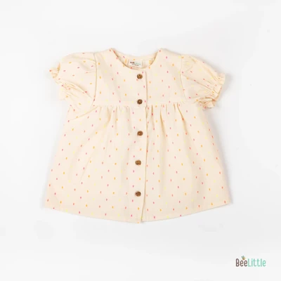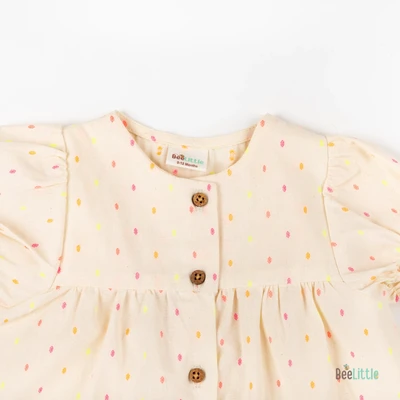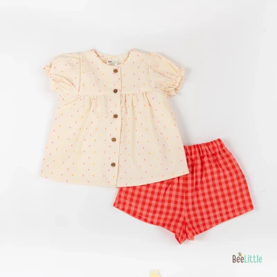 Solid Co-ordinate set of woven designed top & shorts. Figured with gathered yoke line seam, puff-sleeves cuffed with trouble-free elastication and front open neckline fastened with buttons. Coupled with regular shorts of concealed elastication and slip on closure.