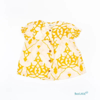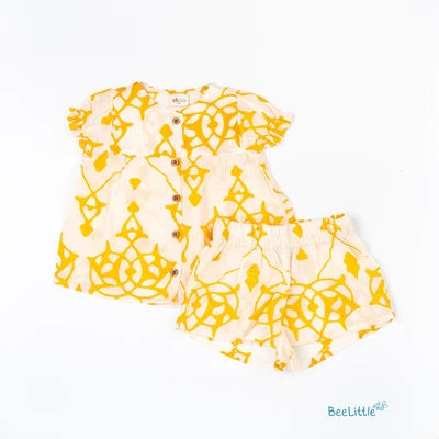 Solid Co-ordinate set of woven designed top & shorts. Figured with gathered yoke line seam, puff-sleeves cuffed with trouble-free elastication and front open neckline fastened with buttons. Coupled with regular shorts of concealed elastication and slip on closure.