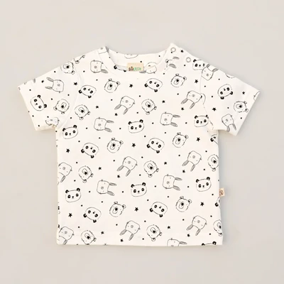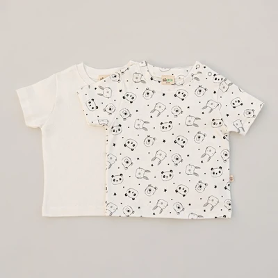 2-pc half sleeved t-shirts that are crafted from organic cotton, ensuring a comfortable and safe choice. They feature 2 snap buttons on the left shoulder for easy dressing. With perfectly finished collars and hems, these t-shirts offer a polished look. Choose from a selection of beautiful plain and printed designs to elevate the style effortlessly.