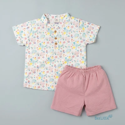 Top and bottom set is the perfect blend of style and comfort. Featuring a mandarin collar, half sleeves, and vibrant ethnic print, the shirt is made with soft and breathable Cotton fabric. The matching solid cotton shorts complete the look with a concealed elasticated waistband for a comfortable fit, creating an effortless outfit that's perfect for any occasion.