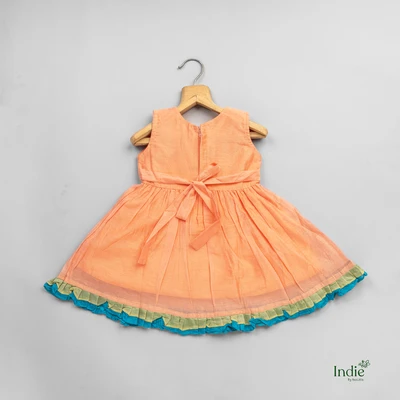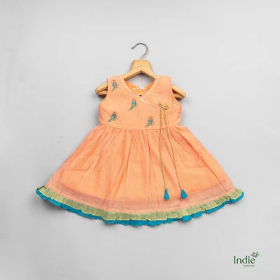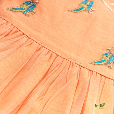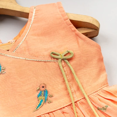 Peach Parrot Embroidered Front Knot Dress With Tie-Back