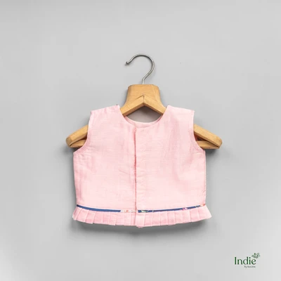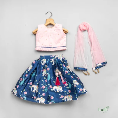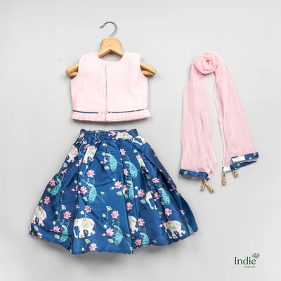 Pink Floral Printed Top And Blue Pleated Lehanga