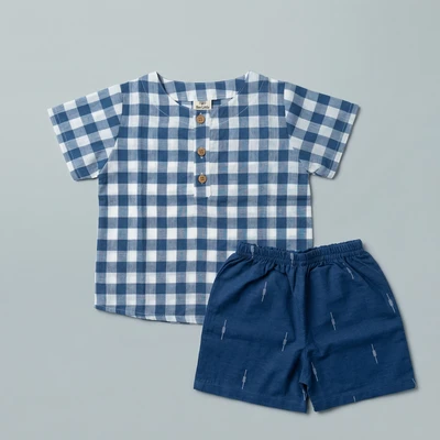 Mul Mul top and bottom set is the perfect blend of style and comfort. Featuring a mandarin collar, half sleeves, and vibrant ethnic print, the shirt is made with soft and breathable Mulmul fabric. The matching solid cotton shorts complete the look with a concealed elasticated waistband for a comfortable fit, creating an effortless outfit that's perfect for any occasion.