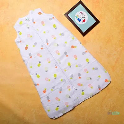 All over printed sleeping sac designed in order to make sure the little foots are kept warm. Sleeveless sac is secured with zip closure initiated from bottom of the sac drawn towards the finely finished neckline.