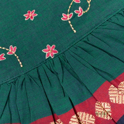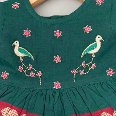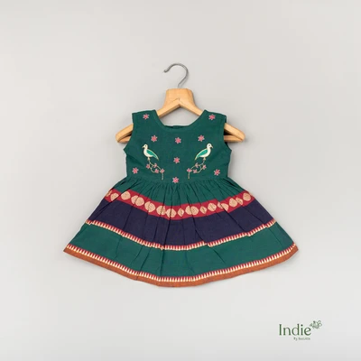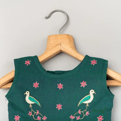 Pink Floral Bird Emberoided Multi Green Sleeveless Tie-Up Frock