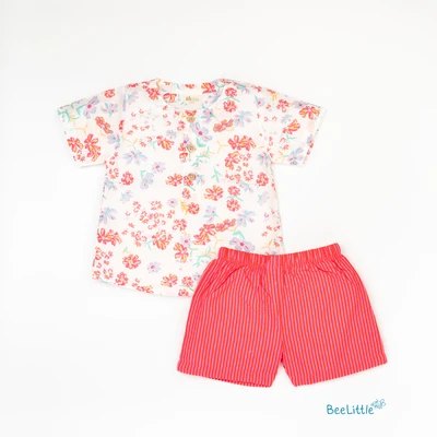 Mul Mul top and bottom set is the perfect blend of style and comfort. Featuring a mandarin collar, half sleeves, and vibrant ethnic print, the shirt is made with soft and breathable Mulmul fabric. The matching solid cotton shorts complete the look with a concealed elasticated waistband for a comfortable fit, creating an effortless outfit that's perfect for any occasion.