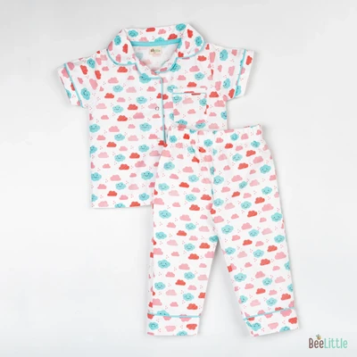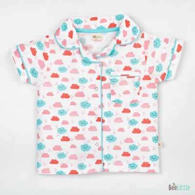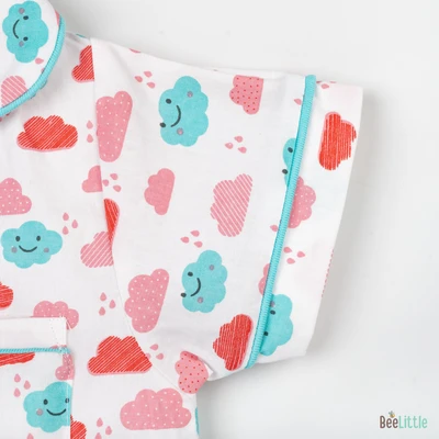 Our Pyjama sets offer comfort and style for your little one's restful night's sleep. Each set includes a short-sleeve button-up top with a classic collar and chest pocket, finished with contrasting piping. The matching pants feature an elastic waistband and piped cuffs. Made from soft, breathable fabric, they are gentle on baby's skin and are perfect for year-round wear.
