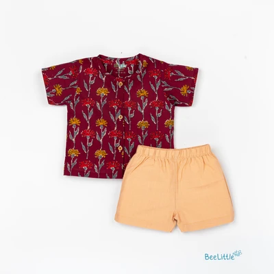 Mul Mul top and bottom set is the perfect blend of style and comfort. Featuring a mandarin collar, half sleeves, and vibrant ethnic print, the shirt is made with soft and breathable Mulmul fabric. The matching solid cotton shorts complete the look with a concealed elasticated waistband for a comfortable fit, creating an effortless outfit that's perfect for any occasion.