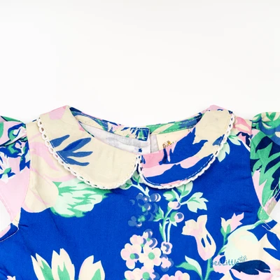 Flared frock has gathered waistline hem and straight button placket. The bodice of the dress is put together by printed fabric, an impeccable detailing self design fabric. Groomed up with a Peter-Pan collar in addition.