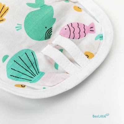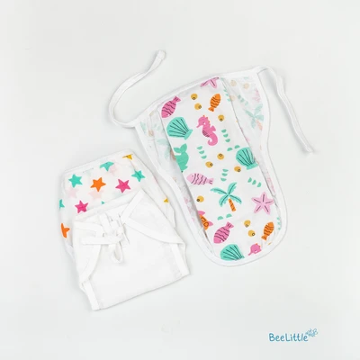 Pack of three newborn reusable muslin nappies. Couple of loops stay upfront, whilst the wide area is edged with tie-ups. Finley sewn side seams, prevents young infants from rashes and skin irritations.