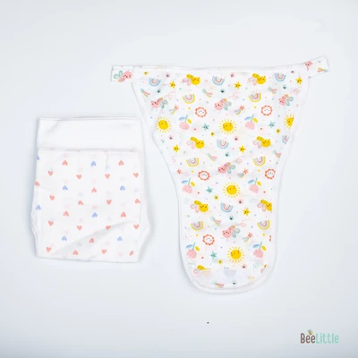 Pack of three newborn reusable muslin nappies. Couple of loops stay upfront, whilst the wide area is edged with tie-ups. Finley sewn side seams, prevents young infants from rashes and skin irritations.