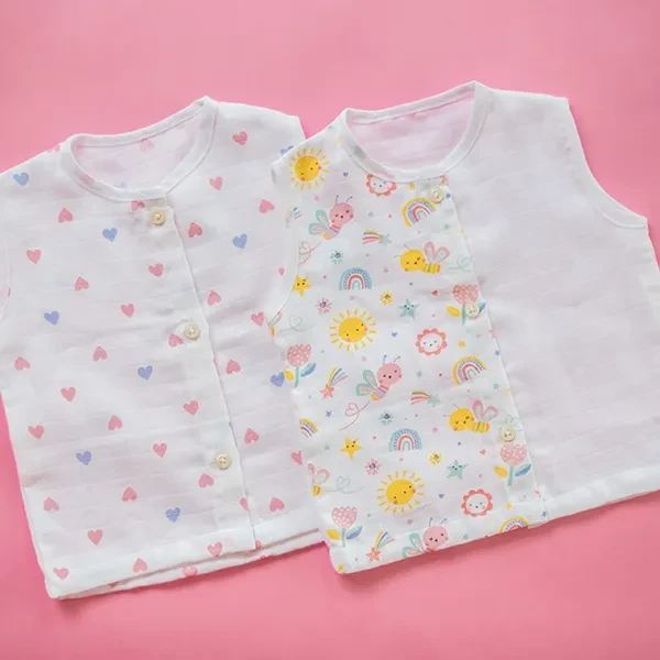 Sleeveless jabla fabricated in pure muslin cotton & outlined in round neckline. The bodice of the jabla is enclosed with straight button placket. This soft and fine weave of cotton fits great for your baby and keeps them at ease.