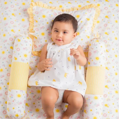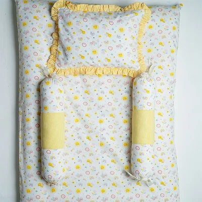 Quirky patterned bed in tight woven cotton filled with kapok silk (Illavam Panju). Naturally anti-microbial and hypoallergenic baby mattress has allover print on both sides. Comes with a pillow and a couple of bolsters, ideal for newborns and infants.