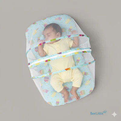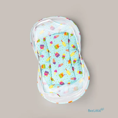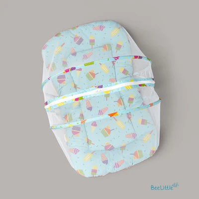 Newborn sleeping mattress with mosquito net is made from cotton material and stuffed with anti-allergenic polyfiber filling. Easy double zipper to build-up the net with two arched frame for support that holds the net wide and to keep it down when required.