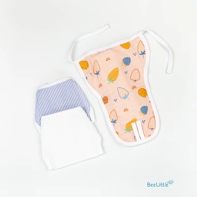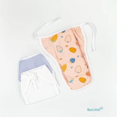 Pack of three newborn reusable muslin nappies. Couple of loops stay upfront, whilst the wide area is edged with tie-ups. Finley sewn side seams, prevents young infants from rashes and skin irritations.