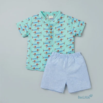 Top and bottom set is the perfect blend of style and comfort. Featuring a mandarin collar, half sleeves, and vibrant ethnic print, the shirt is made with soft and breathable Cotton fabric. The matching solid cotton shorts complete the look with a concealed elasticated waistband for a comfortable fit, creating an effortless outfit that's perfect for any occasion.