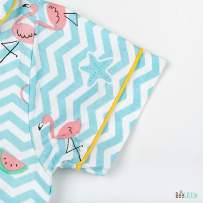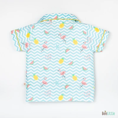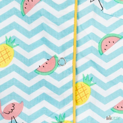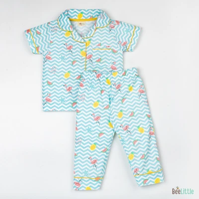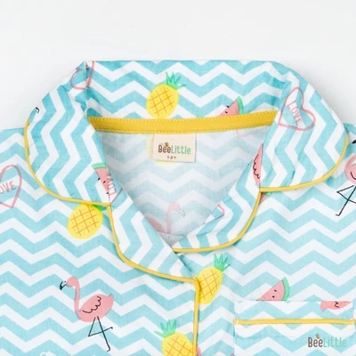 Our Pyjama sets offer comfort and style for your little one's restful night's sleep. Each set includes a short-sleeve button-up top with a classic collar and chest pocket, finished with contrasting piping. The matching pants feature an elastic waistband and piped cuffs. Made from soft, breathable fabric, they are gentle on baby's skin and are perfect for year-round wear.