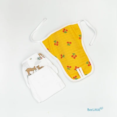 Pack of three newborn reusable muslin nappies. Couple of loops stay upfront, whilst the wide area is edged with tie-ups. Finley sewn side seams, prevents young infants from rashes and skin irritations.