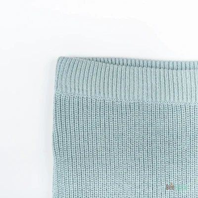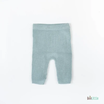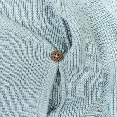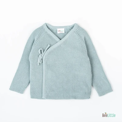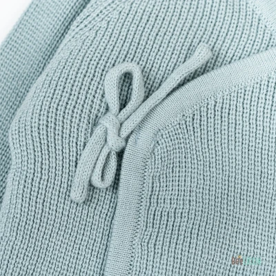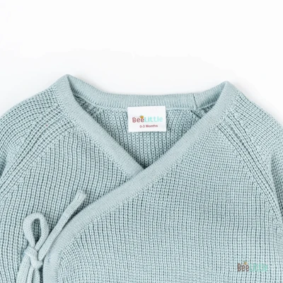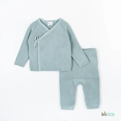 Organic warmer set consists of a sweater and pants. Knitted sweater in ribbed waist hem, round rib crew neck and long sleeves with cuffed trim. The kimono styled vest is secured with a tiny tie-up. Set up with knitted jogger style pants with waist elastication that can be slipped on.