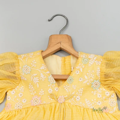 Yellow Kota Doria Embroidered Frock
