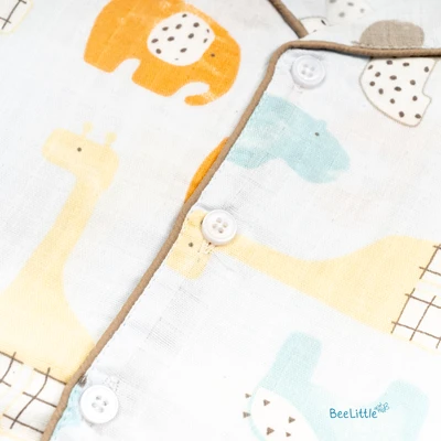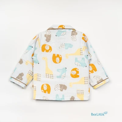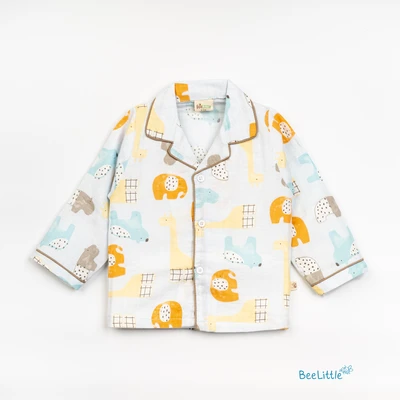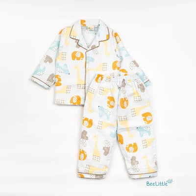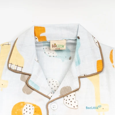Our Pyjama sets offer comfort and style for your little one's restful night's sleep. Each set includes a short-sleeve button-up top with a classic collar and chest pocket, finished with contrasting piping. The matching pants feature an elastic waistband and piped cuffs. Made from soft, breathable fabric, they are gentle on baby's skin and are perfect for year-round wear.