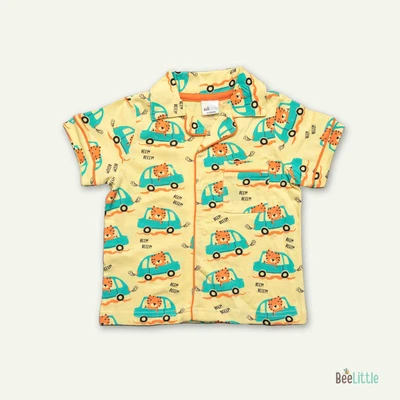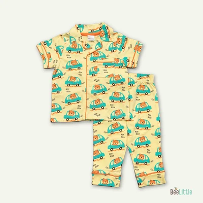 Pyjama set with a shirt and bottom in silky soft cotton material with contrast color piping. Quirky printed shirt is patterned with notched lapel collar, straight button placket at the front, one patch pocket at the left chest and short sleeveless. Suited up with parallel trousers has concealed elasticated waistband and slip on closure.