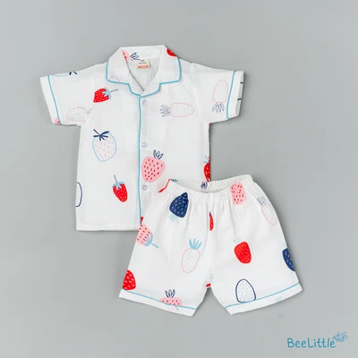 Our Pyjama sets offer comfort and style for your little one's restful night's sleep. Each set includes a short-sleeve button-up top with a classic collar and chest pocket, finished with contrasting piping. The matching pants feature an elastic waistband and piped cuffs. Made from soft, breathable fabric, they are gentle on baby's skin and are perfect for year-round wear.