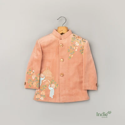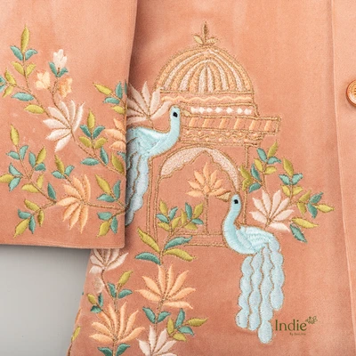 White Peacock Embroidered Red Velvet Kurta With Beige Pant