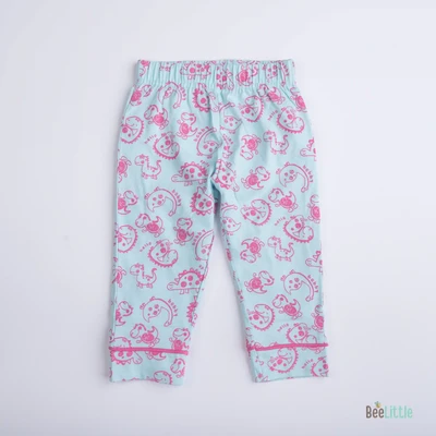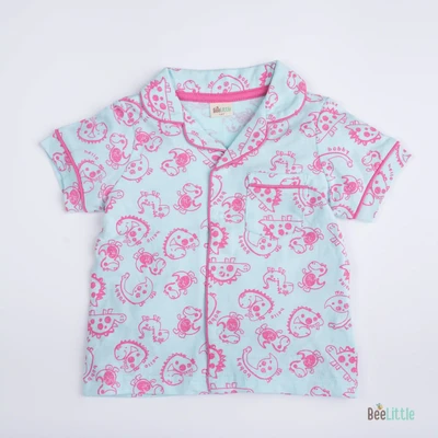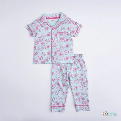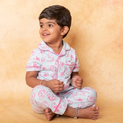 Pyjama set with a shirt and bottom in silky soft cotton material with contrast color piping. Quirky printed shirt is patterned with notched lapel collar, straight button placket at the front, one patch pocket at the left chest and short sleeveless. Suited up with parallel trousers has concealed elasticated waistband and slip on closure.