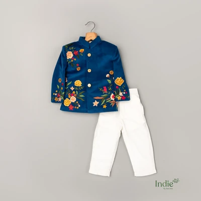 Navy Blue Kurta With White Floral Embroidery And Pearl Accents Paired With White Pant