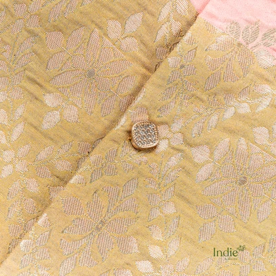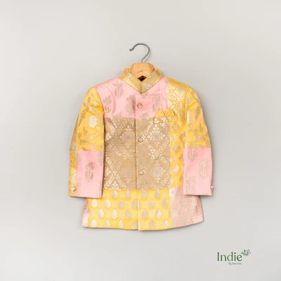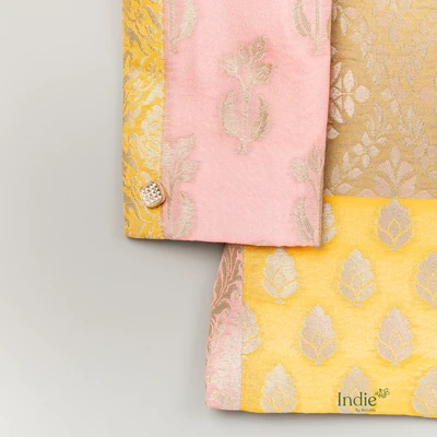 Golden Zari Printed With Gold And Pink Patched Kurta And White Pant