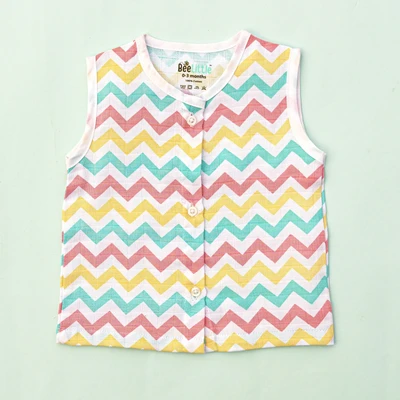 Sleeveless jabla fabricated in pure muslin cotton & outlined in round neckline. The bodice of the jabla is enclosed with straight button placket. This soft and fine weave of cotton fits great for your baby and keeps them at ease.